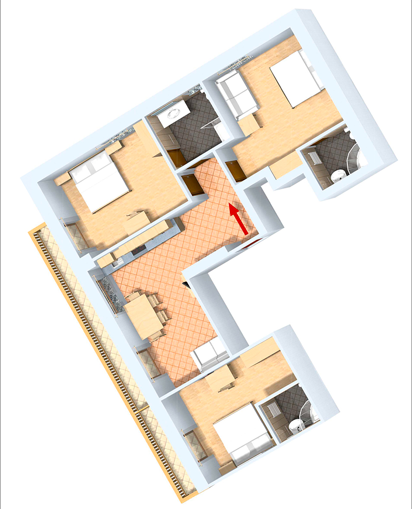 - Es besteht auch die Möglichkeit ein drittes Doppelzimmer der Wohnung samt Bad zu buchen.